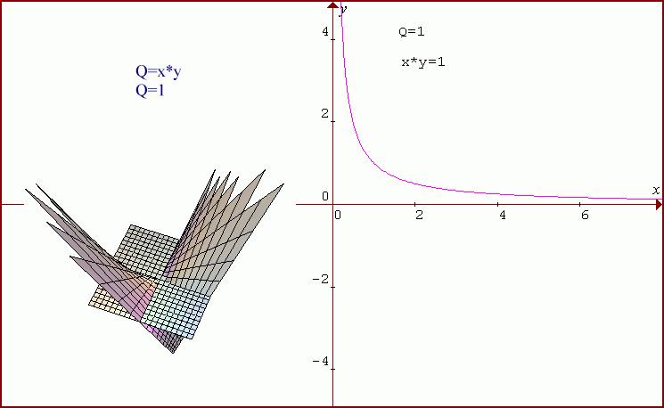 La quantité produite par la meilleure technique du moment dépend des facteurs de production utilisés, qui sont ici {x} et {y}, travaux fournis lors de l'investissement et pour l'exploitation ultérieure. On peut utiliser des procédés plus ou moins "capitalistiques", c'est-à-dire conduisant à des rapports {x/y} plus ou moins élevés.