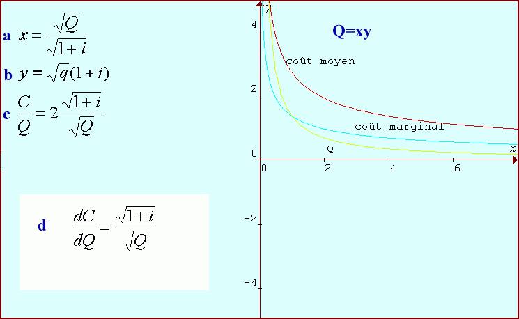 Dans le cas contraire, il y a "effet d'échelle" et le coût dépend de l'échelle de la production. Dans l'industrie, le "rendement croissant" est la règle ; plus on produit, plus chaque facteur est efficace. L'effet d'échelle est alors une réduction du coût avec la production, et l'existence d'un coût marginal inférieur au coût moyen. Si par exemple, {Q=x*y}, l'optimum donne toujours {y=x* (1+i)}, mais il vient :