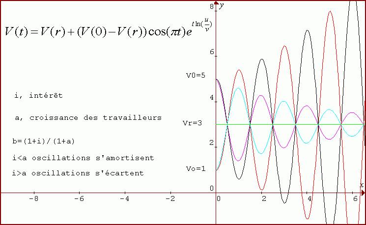 relation où V est le niveau de vie du système de référence de type exponentiel permanent du §6. a, soit {Vr= rac (u)/ (u+v)}. Comme on le voit, l'écart initial {Vo-Vr} provoque des fluctuations ultérieures, Vp passant successivement en dessus et en dessous de la constante {Vr} (ou vice versa).